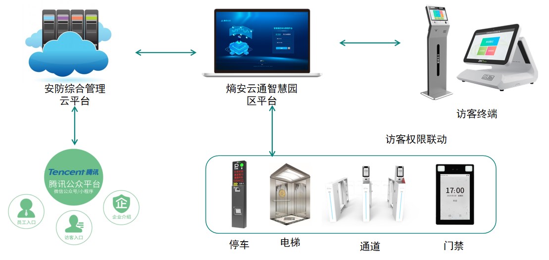 智慧访客系统采用混合云部署方式,线下企业部署熵安云通,管理访客、人行通道、停车场、迎宾信息屏等终端设备;线上启用熵安云通智慧云,与腾讯微信公众号平台无缝对接,形成移动端、云端、线下系统、终端设备的数据实时交互,实现线上预约,终端验证的访客流程。