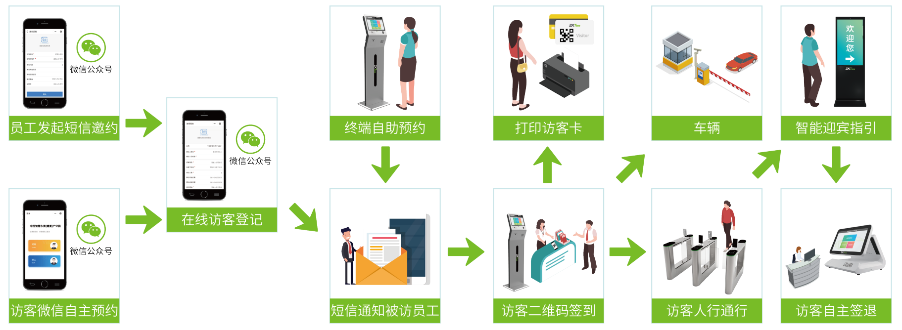 访客来访登记、到访签到、权限下发、拜访完毕签离流程