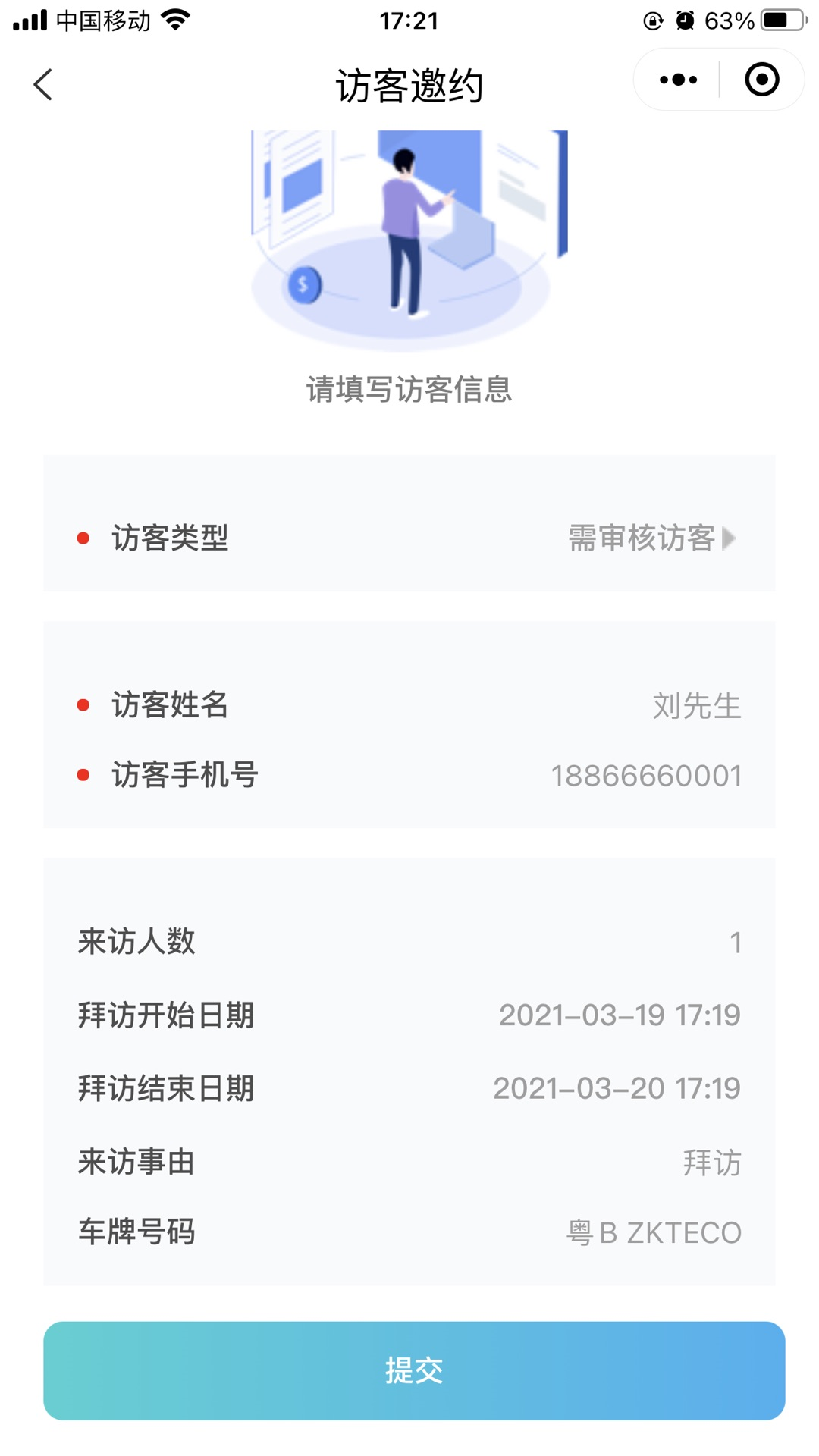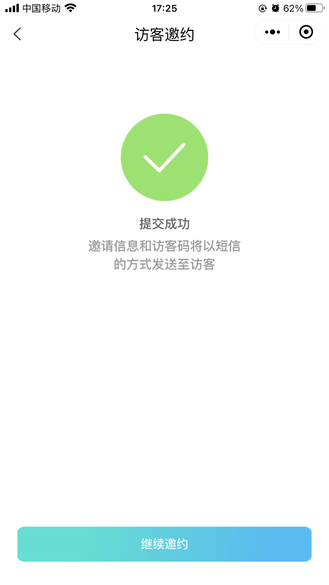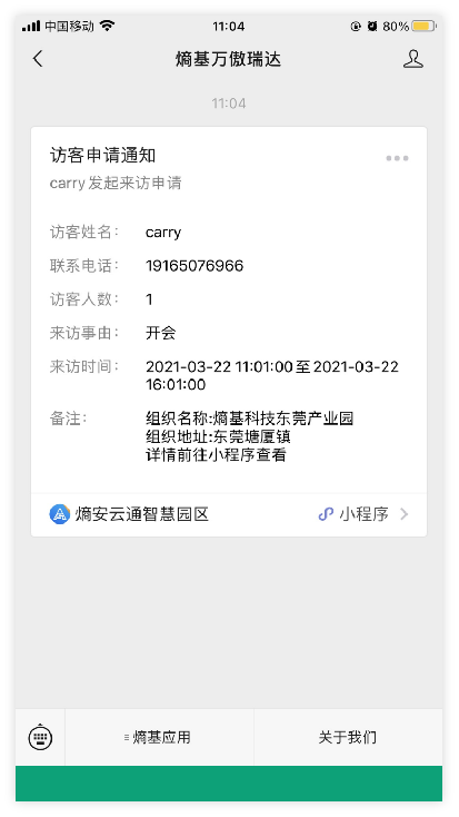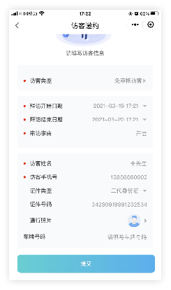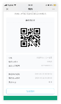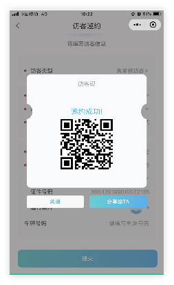 小程序填写完访客信息后提交,系统自己生成访客二维码可直接跳转微信分享给访客。