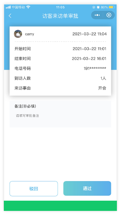 发送邀约短信通知给访客,访客可打开短信链接补充访客信息,提交后系统发送访客通行二维码。